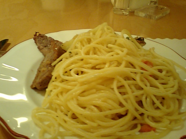スッパの下には、子牛のステーキ、ホタテの何チャラ。