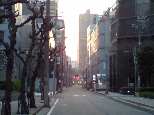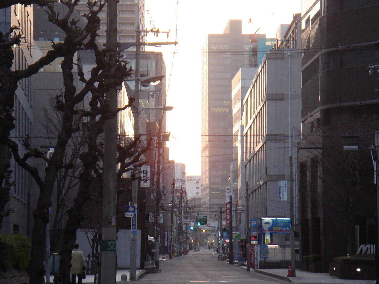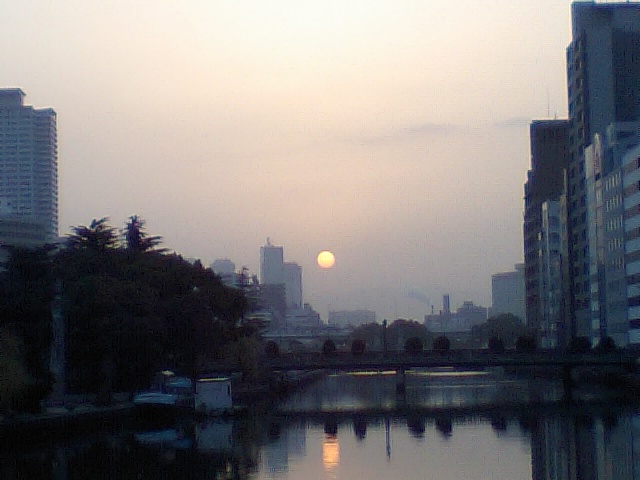 ビルの間に、さっき橋の上から見た何倍ものお日様が・・・