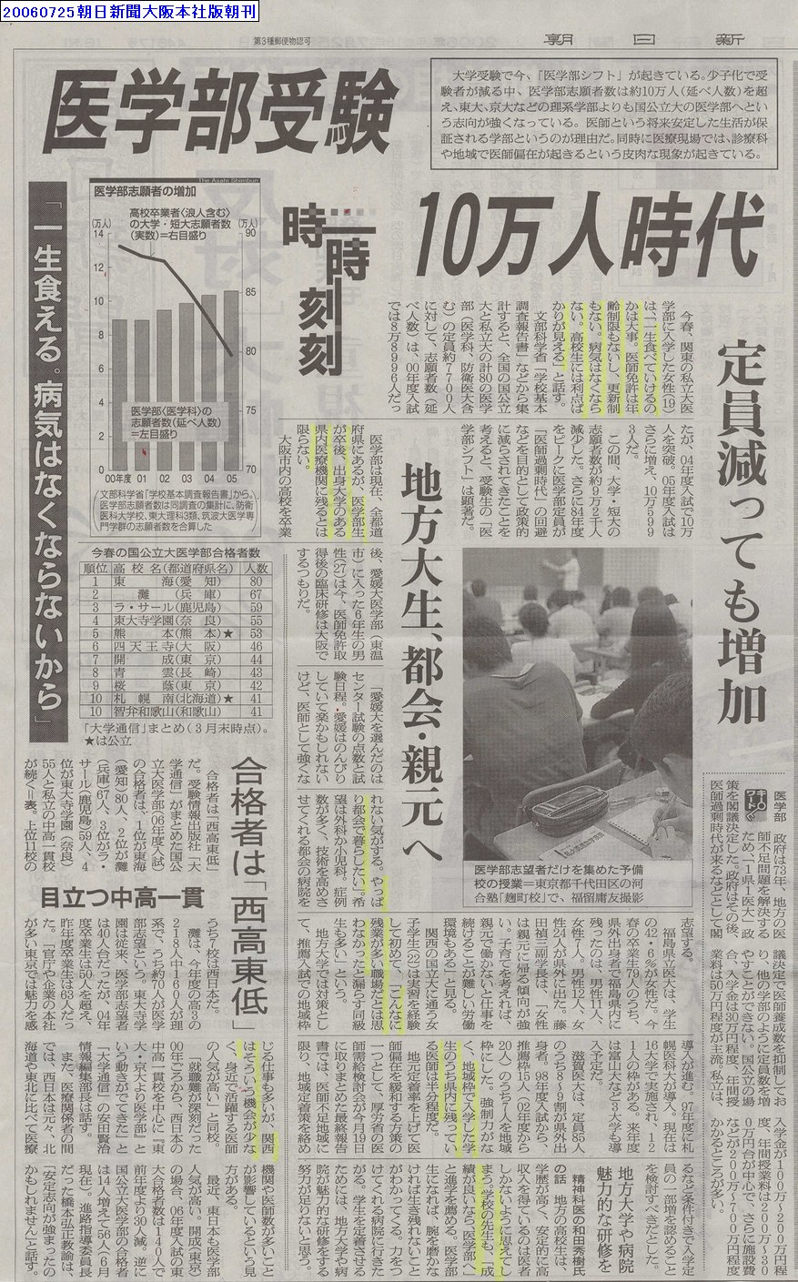 最近、東日本にも医学部人気が高まってきた。開成(東京)の場合、06年度入試の東大合格者数は140人で前年度より30人減った。逆に国公立大医学部の合格者は14人増えて56人(6月現在)。進路指導委員長だった橋本弘正教諭は、「成績上位の生徒が医学部を目指す安定志向が強まったのかもしれません」と話す。