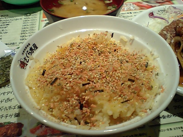 ごはん2杯、たまご2個、海苔3つ、ふりかけドバドバっ