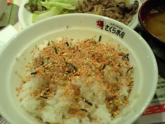 ごはん2杯、たまご1個、海苔3つ、ふりかけドバっ、そうめん大盛1杯。
