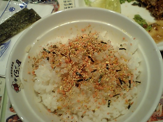 ごはん2杯、たまご1個、海苔3つ、ふりかけドバっ