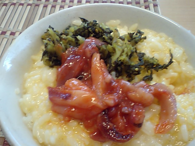 炊きたてご飯にたまご、高菜、塩辛。