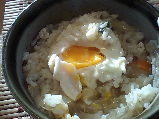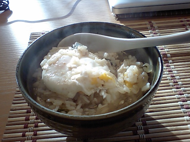 昨夜の水炊きの残り汁で雑炊を食らう。