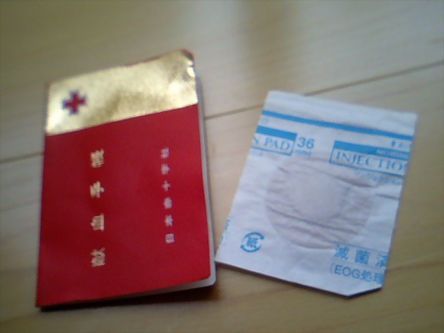 これは献血手帳、止血パッチ付き。
