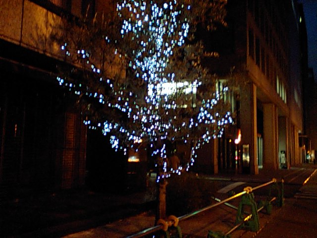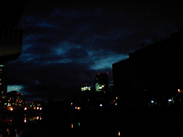 どんよりとした空、赤々と灯るビル、
