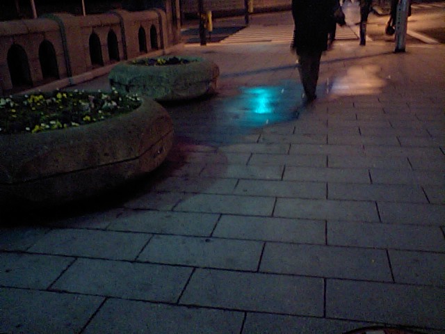 彼方此方に水溜り。青は信号の青。