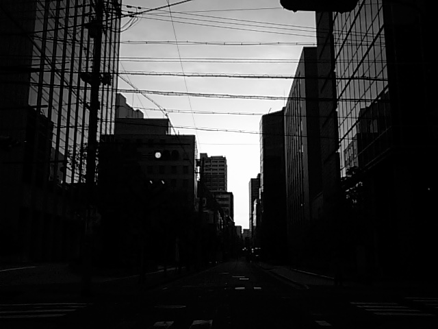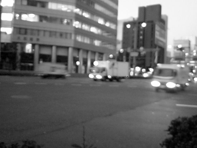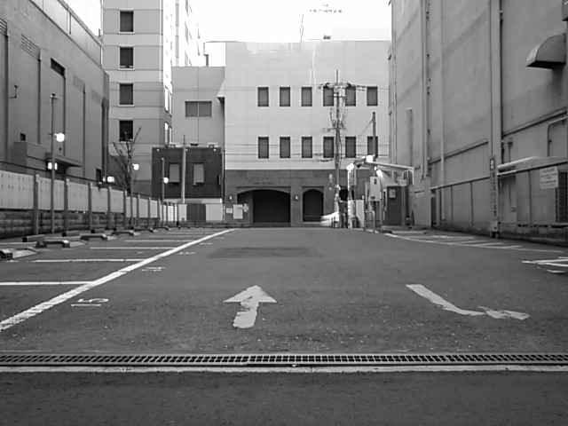 這い蹲って撮ったモータープールとその先のなんちゃら会館。