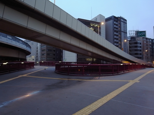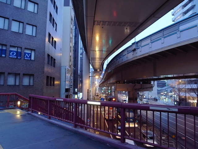 新御堂の降り口と、カラフルな陸橋。