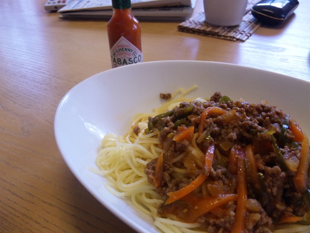 ミートスバ、タバスコぶっかけ。