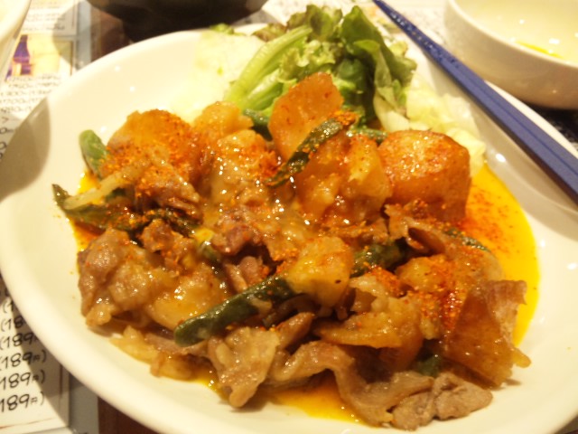 豚肉とジャガイモのガーリックバター醤油炒めたまご一味辣油ぶっかけっ