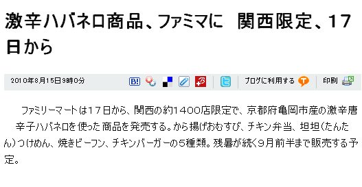 ファミリーマートは17日から、関西の約1400店限定で、京都府亀岡市産の激辛唐辛子ハバネロを使った商品を発売する。から揚げおむすび、チキン弁当、坦坦(たんたん)つけめん、焼きビーフン、チキンバーガーの5種類。残暑が続く9月前半まで販売する予定。