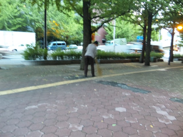 大阪府警研修所前、落ちた銀杏を掃く、デケたおばちゃん。