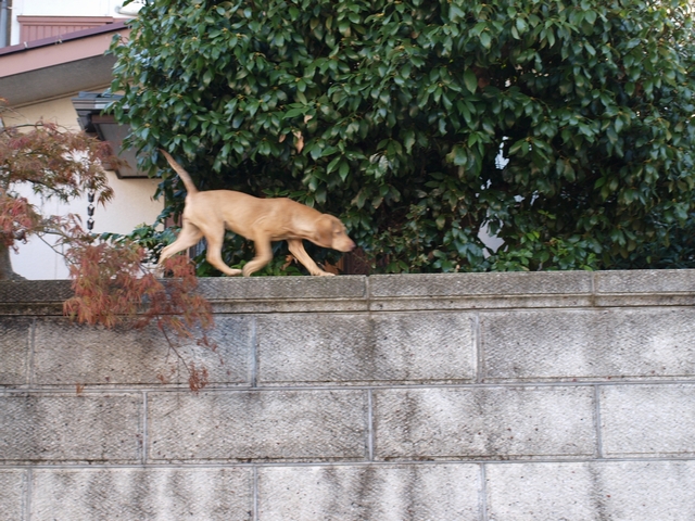 通りかかると塀によじ登り、右へ左へ吠えまくり。