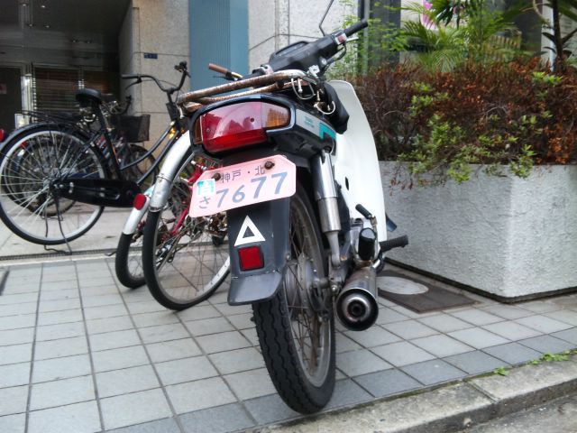 と、路地に入ってピンクナンバー/125ccのカブ。珍しい。