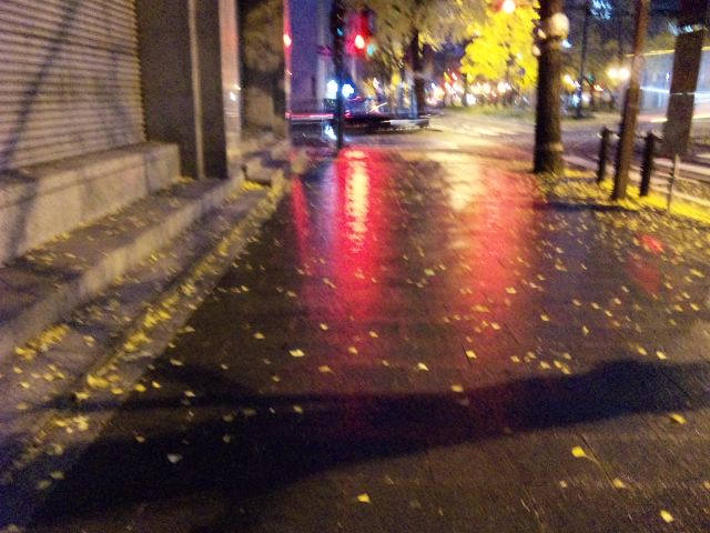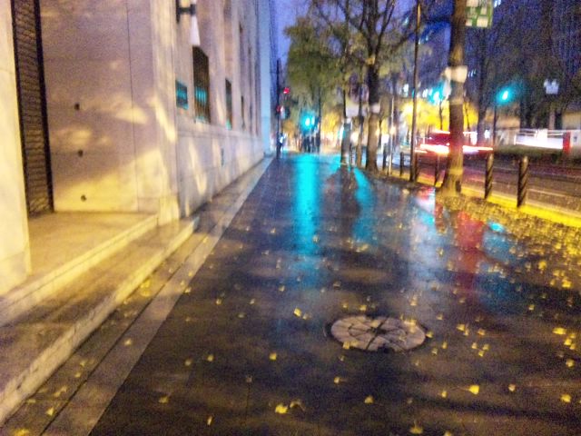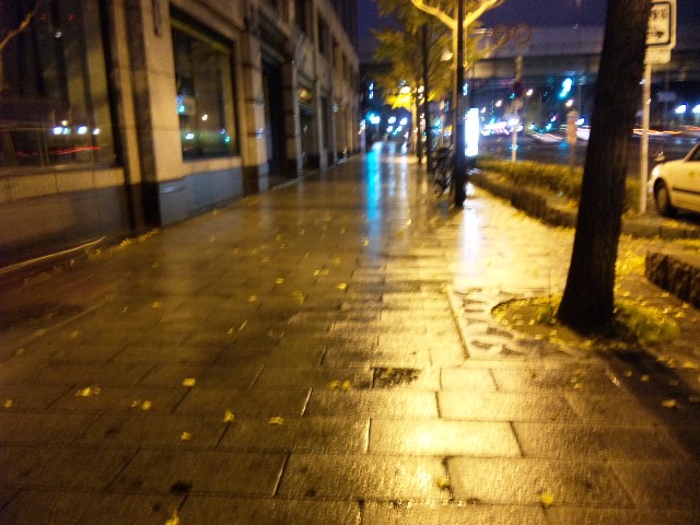今朝は雨に濡れた路面しか撮るもんがない。