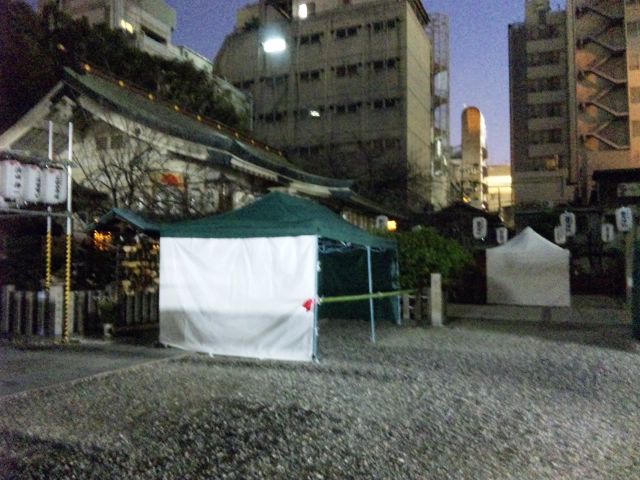 と、迎春準備か、テント乱立のお初天神、露天神社。