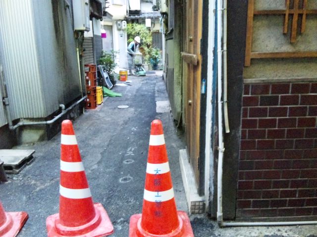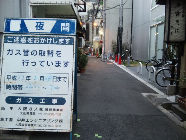 お初天神飲み屋路地、夜どおしガス管工事中。