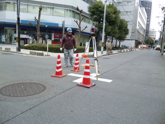 瓦町、道のど真ん中で測量中。