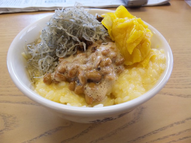 タマゴ納豆タクアンジャコいかなご釘煮。
