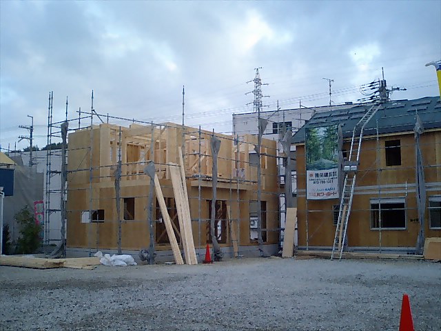 在来やったら棟上げで先に屋根まで乗せてしまいよるからなぁ。
