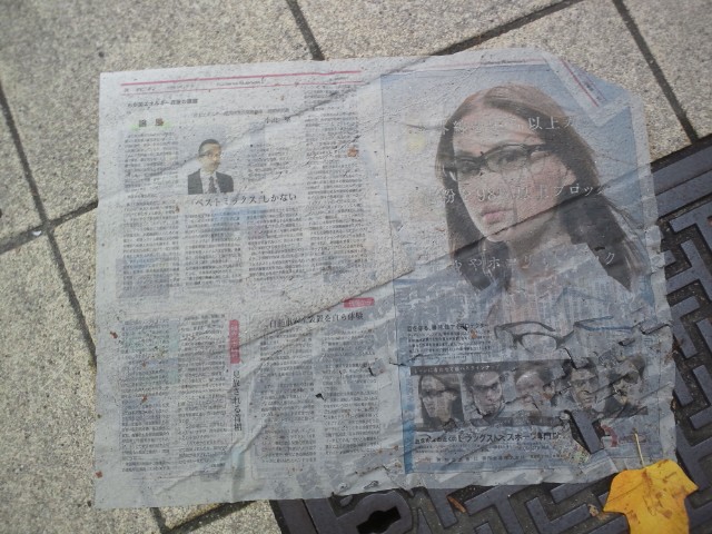 雨上がり、歩道、新聞、マンホール、落ち葉。