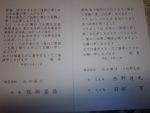 畦野支店長の交代通知ですねん。