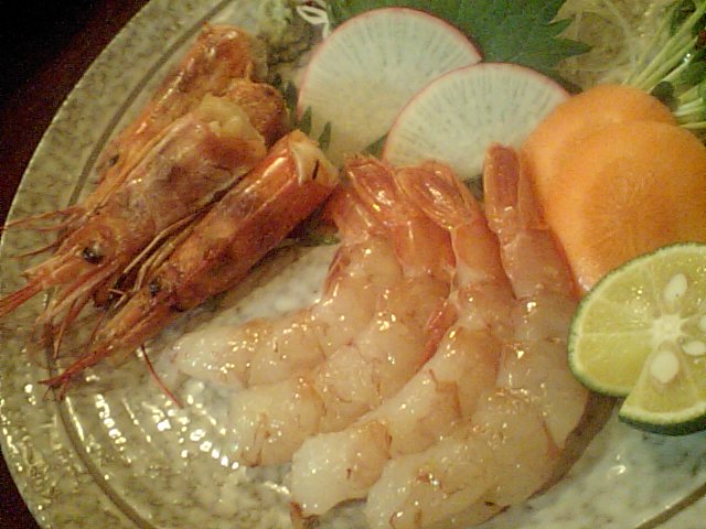 北海道赤足エビのお造り、頭炭焼き付き。