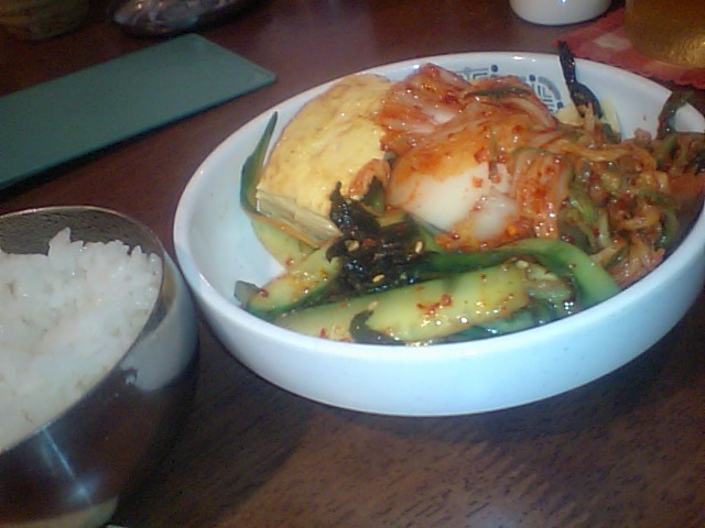 メインにごはん(お代わり自由)、おかず3品(取り放題:キムチ2種と卵焼き)。