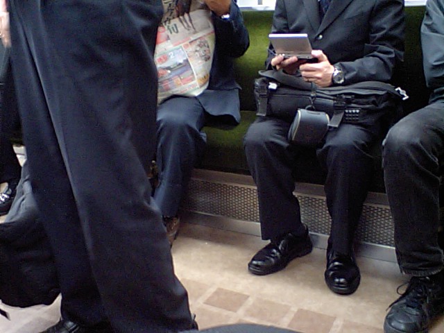 ひとりはモバイルに夢中、ひとりはスポーツ新聞。