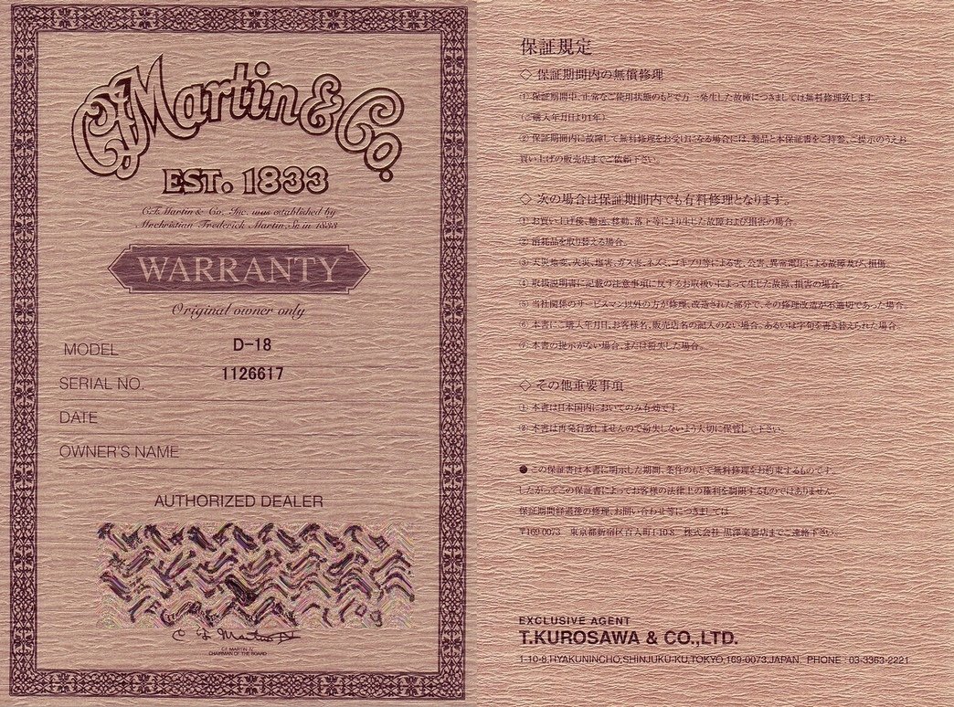 Dシリーズのベーシックモデルとして、又マホガ二ーバック・サイドのモデルとして根強い人気を持つD-18です。しかし本来の鳴りを持つものは極少数です。ショップレベルとして認められるギターも実に久しぶり!当店の基準で選ばれたマホガニーの持つ弾力感と奥行き、そして充実した中域の鳴りを十分に発揮する一本。素早いレスポンスを発揮する食い付きの良いフィンガー、独特の粘りとクリアーさで力強いパワーを発揮するストローク、共に弾き心地の良さを十分に感じて頂けます。ややもすると低域がしょぼかったり、艶っけの無いギターになりがちですが、これは本来のマホガニーの持ち味を実感して頂けるはずです。弾き易くパワフル、ストロークはもちろんフィンガーピッカーにも弾いて頂きたいギターです!正規輸入品でこの音、とてもお買い得!